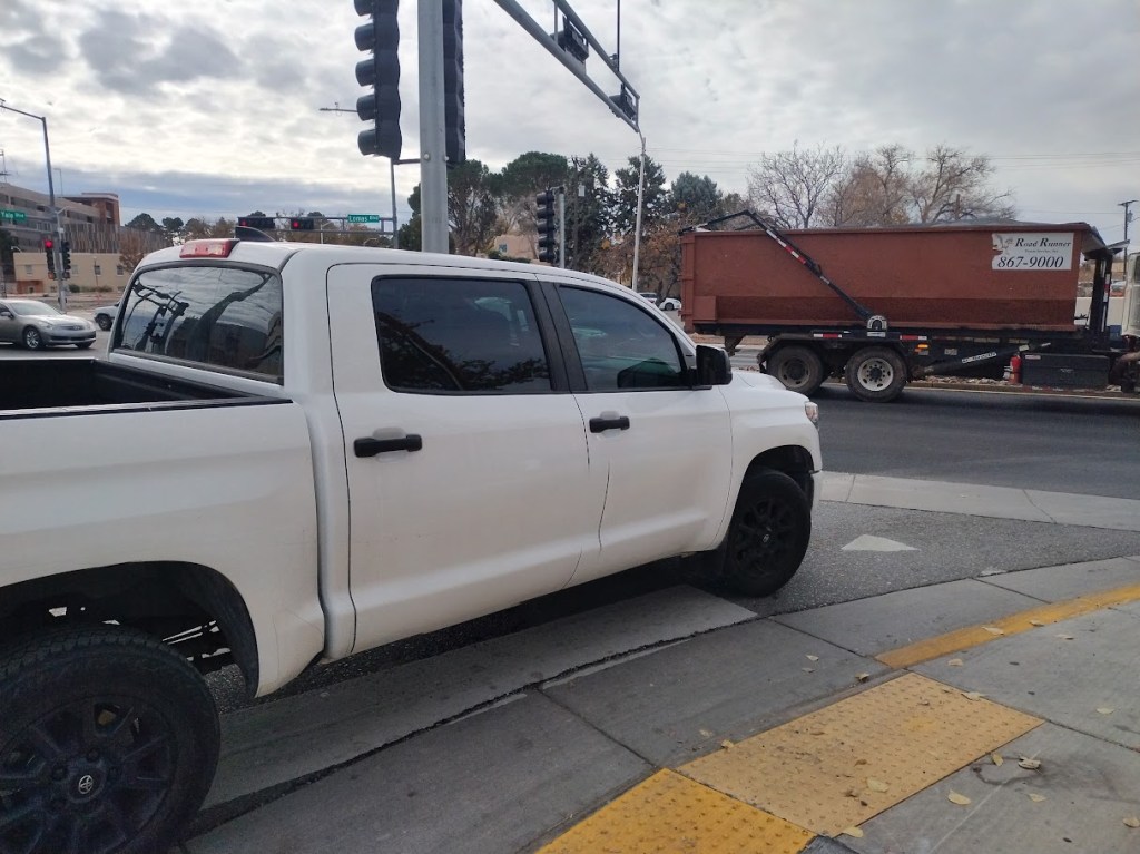 Trying to capture the dangers involved in walking/rolling to that beg button with the same stickers on it makes this maybe the singular time in my life that I’d like to have one of those cameras attached to my bike helmet. The camera would capture, probably poorly, the eye movements necessary to safely approach that beg button through the slip lane from the sidewalk connecting the parking lot to the North Diversion Channel.