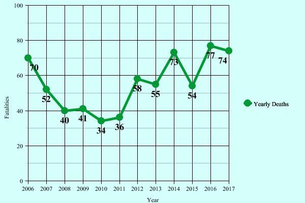 TRU having compiled and made available online data since 2006, we are able to make the simple graph above, including the 74 pedestrian fatalities reported in 2017, just below the recent record of 77 in 2016.