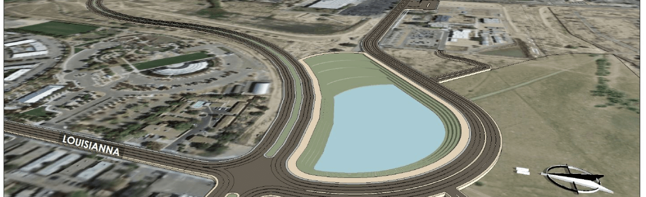 One also notes the 2016 date on the mock-up; again, these plans have been around in various guises for decades. Who knows if this latest idea will “fly” (get it, Air Force Base, “flyover,” I’ll stop now), but it does remind us of the view at the current, and currently obscure, western terminus of the on-again/off-again road known as Gibson Boulevard, way out in far SW Albuquerque: