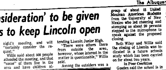Back on April 16, 1970, when Lincoln was first proposed to be closed by the APS School Board, there was a raucous Board meeting reported in the Albuquerque Tribune. It takes up everything but the many, super-duper interesting ads on this page of the next day’s paper: