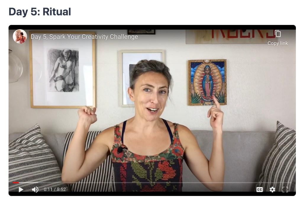 Our last challenge (today!) is to come up with a ritual to spark our creative juices. Light incense, meditate, announce to your studio that you’ve arrived, free-write—doesn’t matter what it is, just do it every day to set up—to signal—the beginning of a creative session.