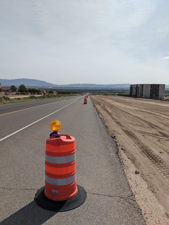 Yesterday, I was riding the wrong way uphill on the shoulder of Dennis Chaves Blvd. (NM-500), trying to stay with the orange barrels, seen above, between me and the many drivers zooming downhill.