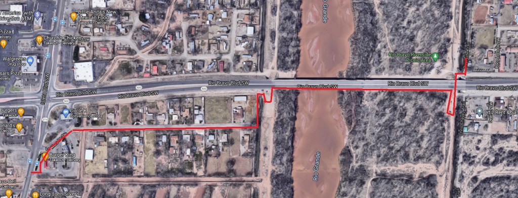 When I first moved way down to the Deep South Valley (DSV) back in 2000, I rode home by just taking Rio Bravo westbound across the bridge, then snuggling in (somehow) to the double left-turn lane at Isleta, and left southbound on Isleta.