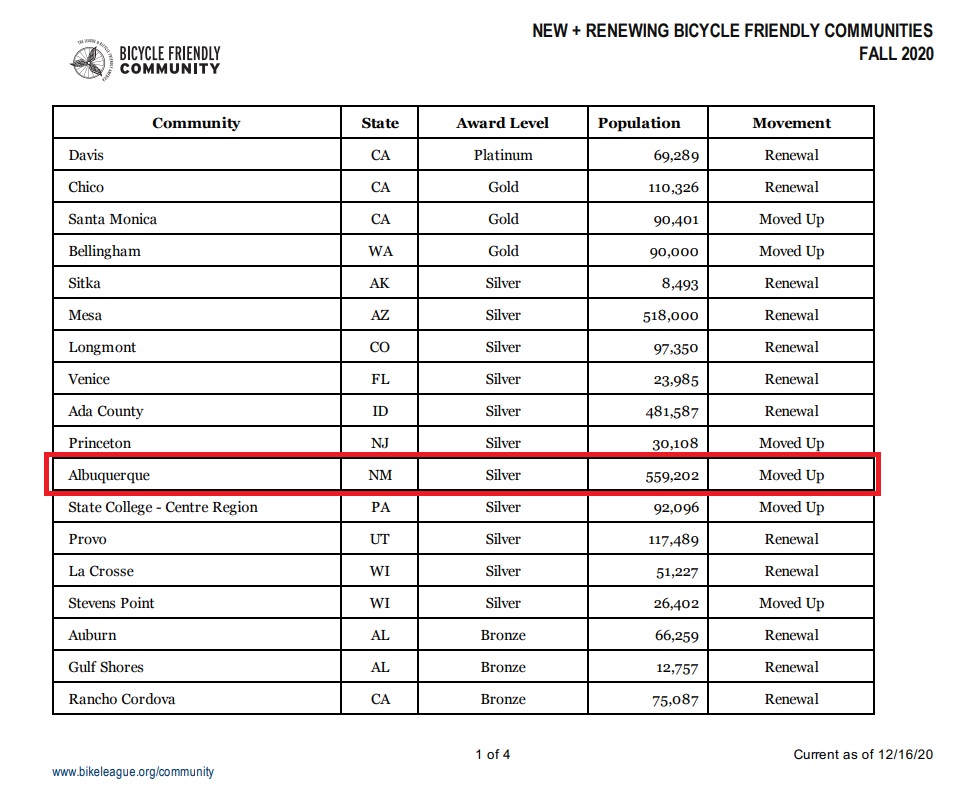 Just taking the above questions from the rubric, one could successfully argue that the new 20 mph Downtown Safety Zone is a good example of improved bike-friendly laws. And perhaps that argument, and others, were successfully made. We don’t know because ABQ’s application and League grading responses have yet to appear on its website.