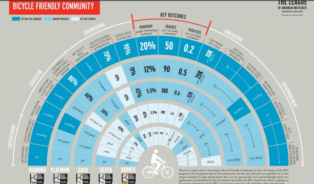To aid your squinting between seizures in looking at the above, cities are graded on things like “Crashes per 10k commuters” and “Bike program staff per X citizens” after communities submit a detailed application to the League. Some dear BB readers out there participated in recent League online and phone surveys conducted as part of its grading process for Burque. Your humble blogger chimed in as well.