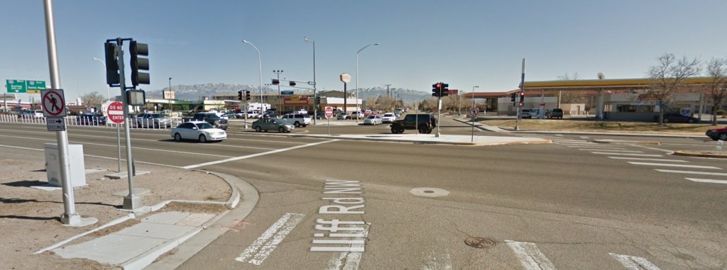 You first notice as you get to the intersection that there’s Albuquerque sand in your shoes because there’s been no sidewalk. Smiling a bit at the 8 feet island of sand-filled sidewalk at the intersection, you also see a sign telling pedestrians they have to cross Iliff, as there’s no crosswalk of Coors on this side of the street.