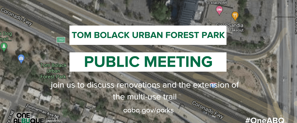 On what should be a *delightfully cool, damp early evening, CABQ Parks and Recreation is hosting an outdoor public meeting today at **Tom Bolack Dog Urban Forest Park from 6:00 to 7:00 PM to outline proposed improvements, including what looks to be a fascinating multi-use path extension to San Pedro Blvd.