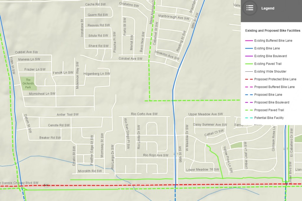 And the screengrab above very much tells a story, one with many twists, turns, and what-have-you’s (to quote the immortal bard) in terms of many things, including current and future non-motorized transportation in the SW Mesa.