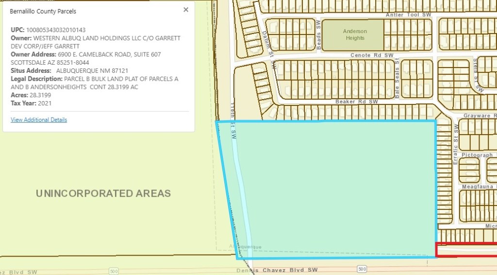 As you can see from the above, the owner of this parcel in blue is “Western Albuq Land Holdings LLC…” If you’ve followed area news fairly closely over the past many years, that name might/probably/definitely rings a bell.