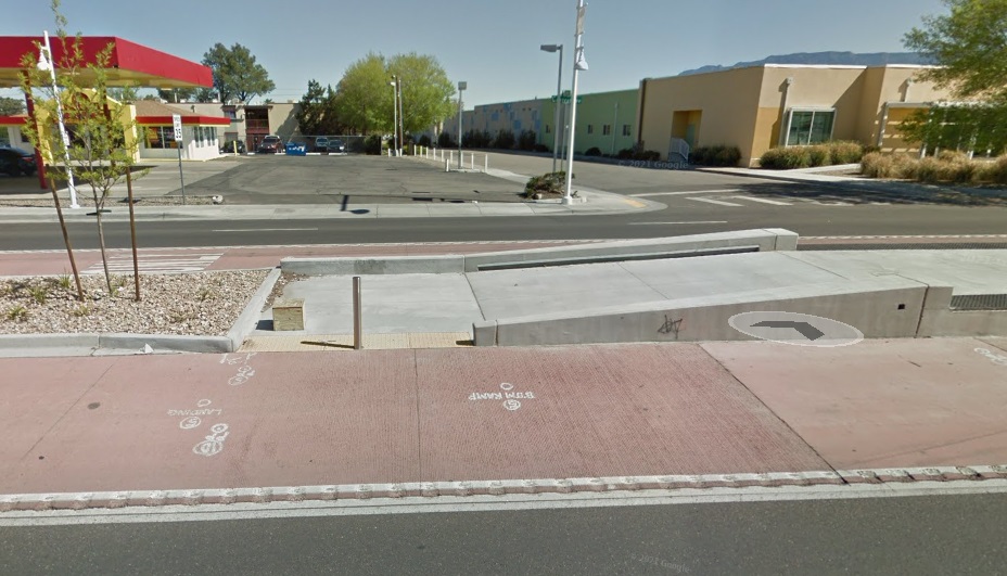 The unfinished A.R.T. stop at Laguayra Dr. is ~500 feet west of San Pedro and ~700 feet west of the signalized intersection at Alvarado. As is true throughout East Central, shops/restaurants and other reasons to cross Central are plentiful, yet signalized crossings are widely spaced. Many intersecting streets such as Laguayra create “mid-block crossings,” leaving travelers such as Mr. Rivera with the oft-dangerous choice between minutes upon minutes of walking/rolling to the nearest signalized crossing (which are often highly dangerous themselves) and the much quicker direct crossing.