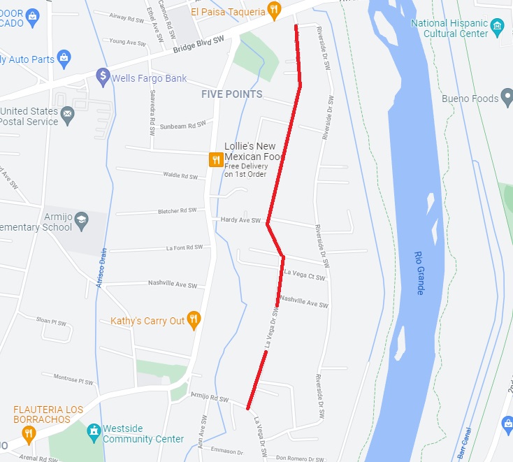 In the meantime, I’ll tell you, dear BB reader, what I tell my friends/acquaintances. Screw riding down Isleta, at least from Bridge Blvd. to nearly Rio Bravo Blvd. Instead, take newly ordained “bike route” *La Vega SW instead, especially now that it’s been gloriously repaved from just south of Bridge to Armijo. La Vega runs parallel east of Isleta (home of Kathy’s Carry Out, etc.) just west of the River.