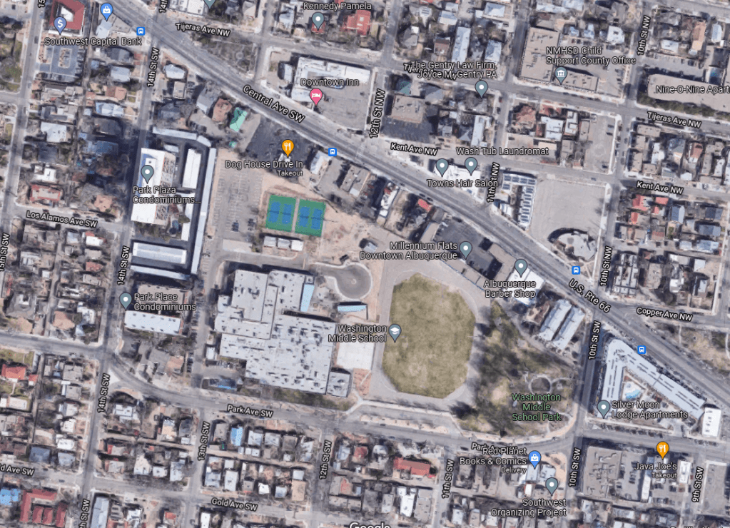 Yes, for those squinting hard, we’re between 10th and 14th Street SW here, just south of Central Ave. at Washington Middle School and adjacent Park. BB proposes that APS sell the property to NM United/CABQ (but really Netflix), trade/buy land for a new middle school in Barelas/South Broadway/San Jose neighborhoods, and put, for naming rights sake, “Netflix Park” in this central, historically meaningfully crossing between Old Town and “New Town” Albuquerque.