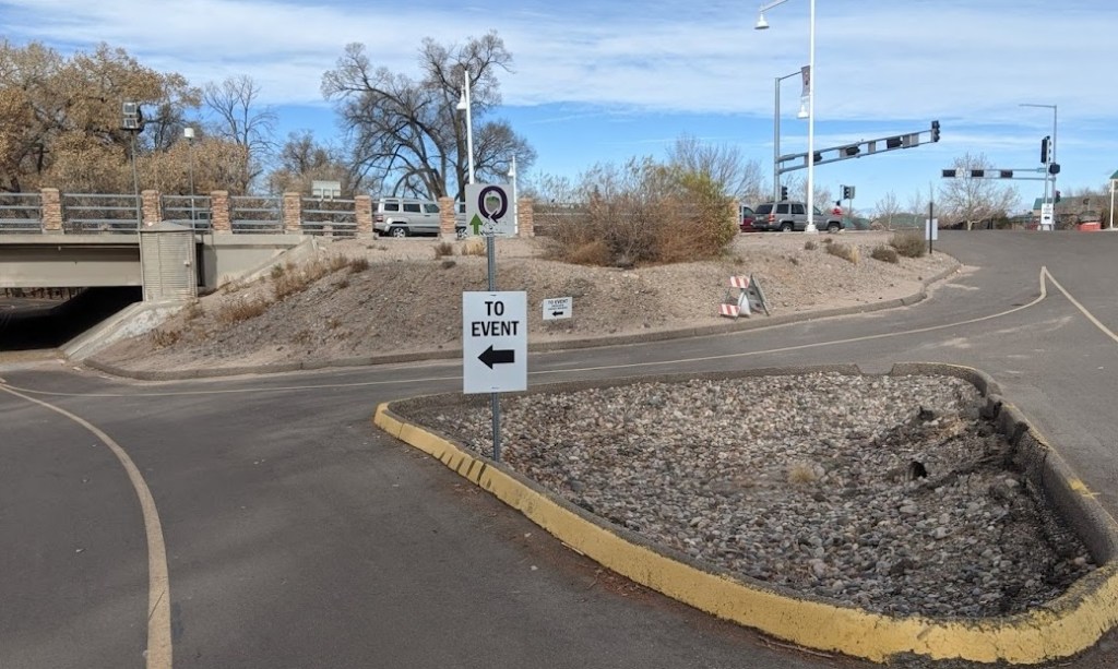 Can’t personally 100% confirm the “To Event” signs shown below have gone up along the Bosque Path at Central only after the killing of 7-year-old Pronoy Bhattacharya, as he and his father tried to cross Central Ave. at Tingley Blvd. (top right in photo) to get to/from the River of Lights on December 12th.