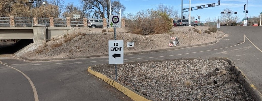 Can’t personally 100% confirm the “To Event” signs shown below have gone up along the Bosque Path at Central only after the killing of 7-year-old Pronoy Bhattacharya, as he and his father tried to cross Central Ave. at Tingley Blvd. (top right in photo) to get to/from the River of Lights on December 12th.