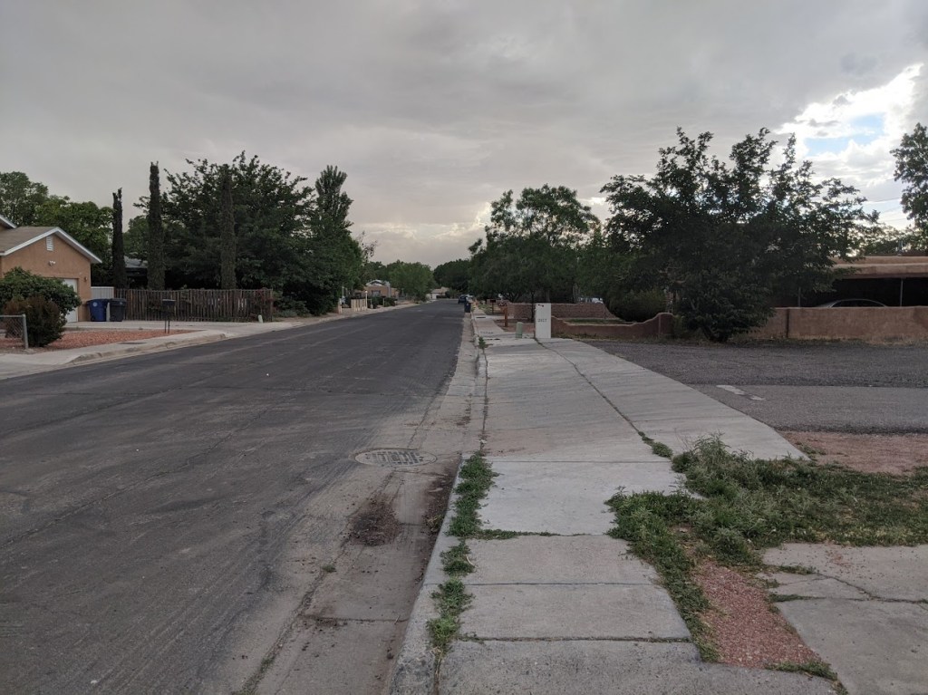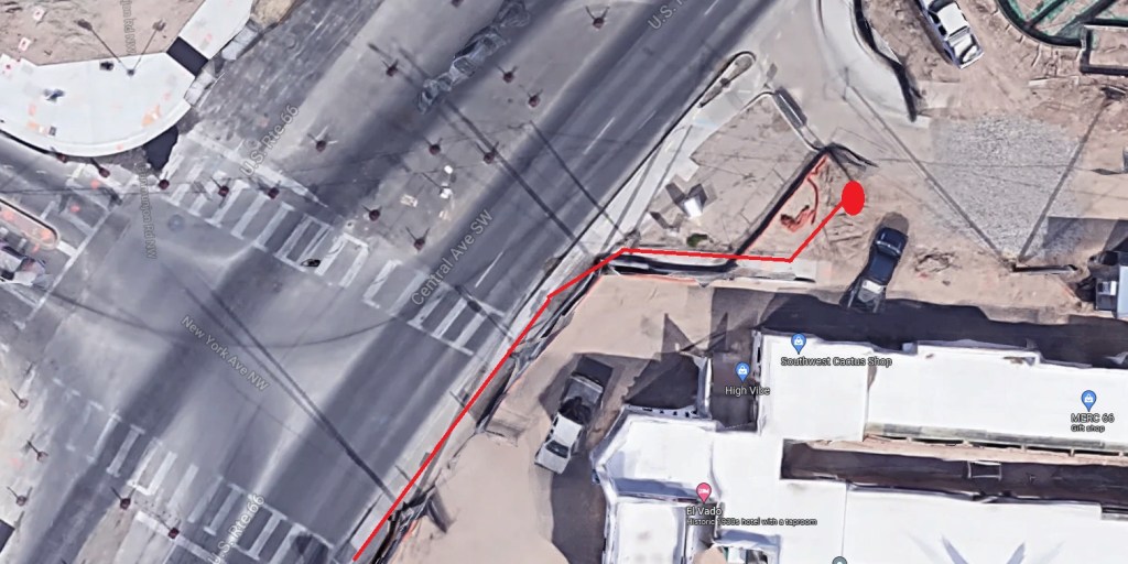 At first I wasn’t going to use Google Streetview’s aerial shot, as it’s from the A.R.T./El Vado construction days, but decided it’s funnier this way. Navigating the sidewalk travel show in red above is tricky, as you have to guess which sidewalks lead to curb ramps and which just lead to curbs. Not shown here is that you can catch a HAWK signal further southwest on Central at the Bio Park.