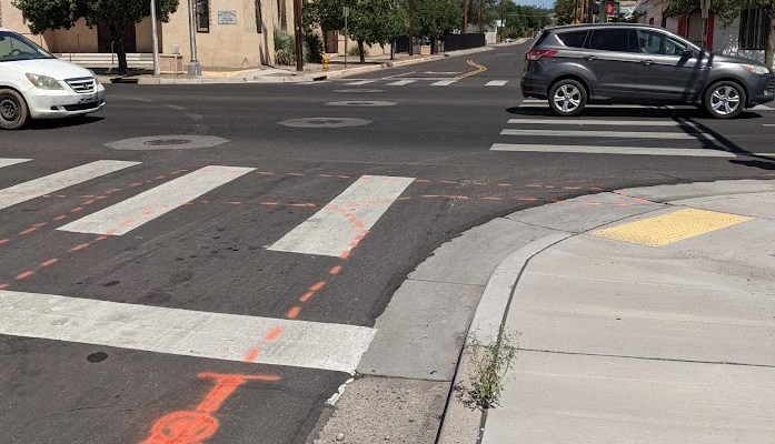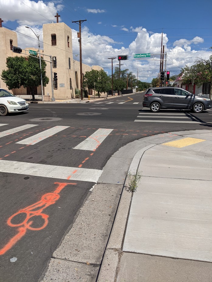 Heck, I’ve written about how loverly this stretch is going back to something called “Duke City Fix.” Yes, I miss it, too. Well, despite its loverliness, there’s been a glitch at the intersection of Pacific and Broadway. Long glitch short, there’s been no “loop detector” installed to detect *steel bicycles (and they have to be steel to be detected, we’re told). Loop detectors run under the pavement at intersections to alert the “brain” scheduling signal timing that a driver/cyclist on the less-traveled street has arrived at the more-traveled street. In this case, little-traveled Pacific and more-traveled Broadway.