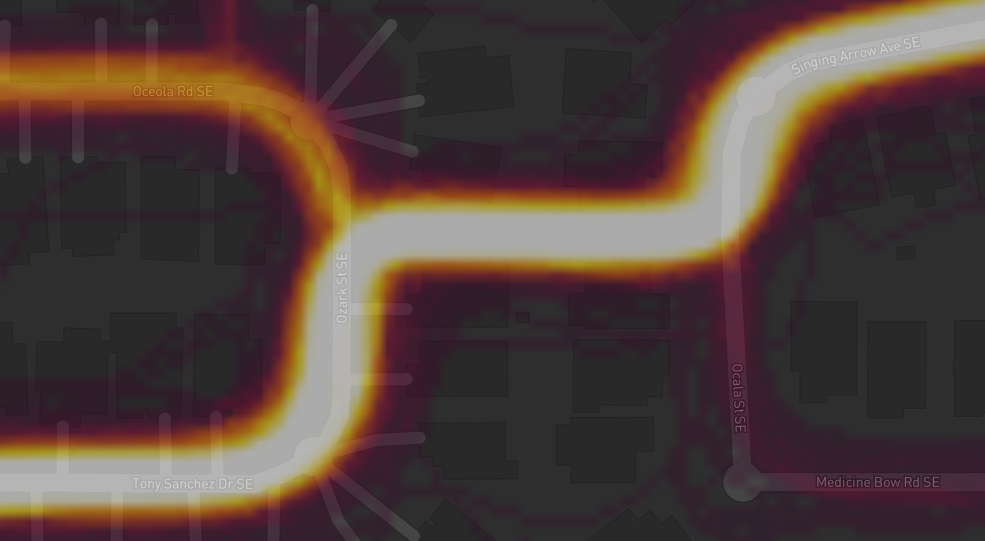 The faint red heading south down Ocala to Medicine Bow SE indicates far fewer riders. These are largely Strava users who missed the sign/bollards. The somewhat brighter orange at top-left indicates greater usage, while the very bright orange-yellow indicates far more cyclists going down the obscurely-signed path and heading south and then west from there on the wonderfully named Tony Sanchez Dr. SE.