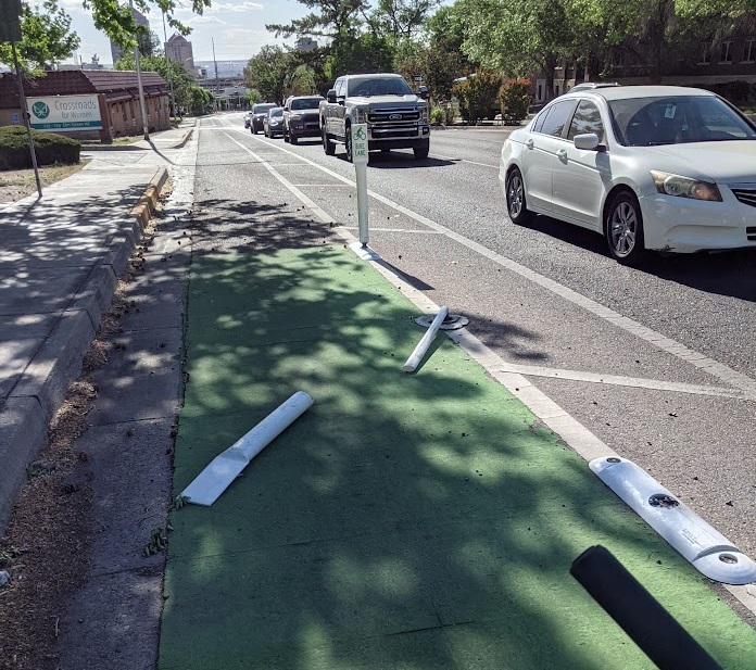 They should really put those flexposts on the outside of the buffer, near the cars. That’s the completely obvious and correct way to do it. So someone had to deliberately decide to NOT do that, which effectively makes the driving lane seem 2 feet wider than it actually is, and thus promotes more car speeding.