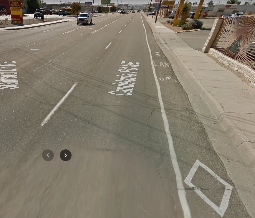 In fact, a look through the years of Streetview images reveals that sometime between 2011 and, most likely, 2014 some CABQ Department of Community Development folks went out to put snazzy new striping and thermaplastic bike lanes symbols (LOOK, the cyclist has a HELMET on now!) on this stretch of Candelaria and did NOTHING to widen the bike lane to any width resembling a “modern” expectation for such infrastructure.