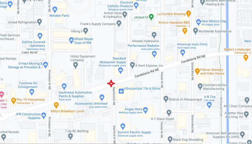 The red star at Candelaria/Stanford marks the spot of the photo above that I took this morning, July 14 (Happy Bastille Day!) 2023. That’s a shameful excuse for a bike lane and a shamefully funny bike lane symbol “thermaplast.” It’s not the only such shameful lane/thermaplast in town, but I do recall that in a rather extensive measurement of Albuquerque bike lane widths Better Burque conducted a few years back, this stretch of Candelaria was “winner” of “Skinniest Bike Lane in Town” at 31 inches. And that’s with a posted 40 mph speed limit, mind you.