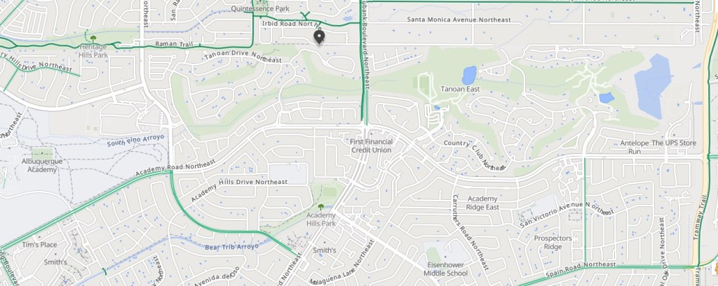 1. Yes, I’d wager it has everything to do with Tanoan’s money & power. Yet is it really a win for Tanoan when Academy is an excessively fast and menacing 4-lane expressway with abruptly-disappearing bike lanes, while the alternate route, Spain, is a much nicer bike ride, a slower, quieter two-lane street with a wide, continuous bike lane from Wyoming to points east of Tramway?