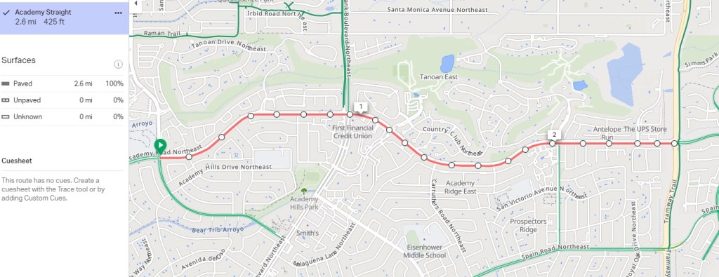 Email me at betterburque@gmail.com or comment if you want a link to the Academy Wander route, but all you gotta do is piece together your own version using the tenets of LSPism. One big complexity in this particular example, in addition to the near universal ABQ tendency for residential streets to loop about and/or hit arroyos, is that Tennyson NE and other parallel roads to Tramway don’t get you to Tramway without the need to do higher stress things like get on Academy for a bit.