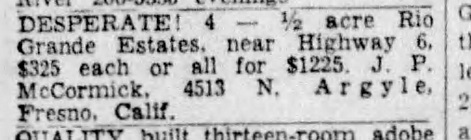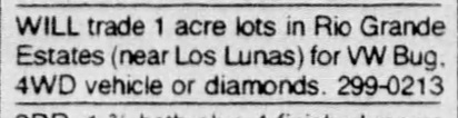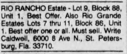 Very long story deserving of several blog posts short, while some houses were built on Rio Grande Estates and other “Rio Communities,” the sorta-kinda municipal term we use today for the northern reaches of Gen. Campbell’s 100,000 acres, many more lots turned into transparently frenzied ads over time in Albuquerque newspapers from folks all over the country.