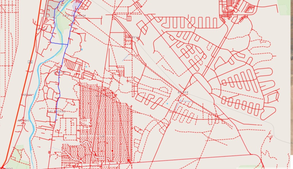 For added incentive, some of us play silly GPS games where you get “credit” for riding places for the first time. One of these games is “Wandrer.” In Wandrer parlance, roads and “roads” you haven’t ridden show up in red (roads you ride show in blue). Solid red lines are, supposed to be, paved; dashed red lines are dirt roads/paths/cattle tracks. Here’s what the same stretch of Rio Grande Estates/Tierra Grande looks like in Wandrer.