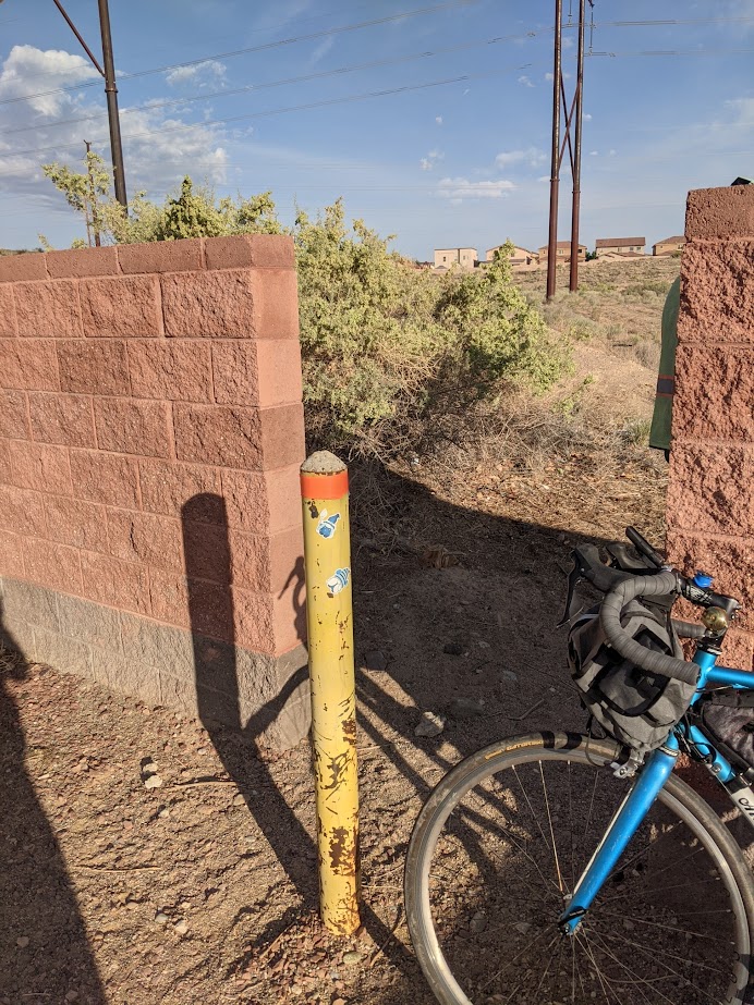 Speaking of road names, on all these excursions we’re always on the lookout for additions to our informal Low Stress Cycling Network (LSCN), a collection of residential streets with mid-block crossings of major roads/stroads. As is true in many stretches along the West Mesa, my favorites this time were edge streets adjacent to the currently unhoused Mesa (principally Petroglyphs National Monument fenceline in this case). Streets like: