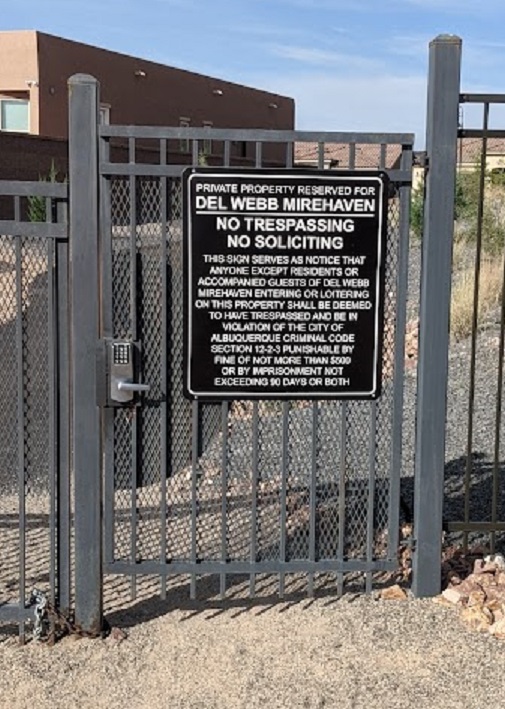 I don’t know if it constitutes “Public Improvement,” but the main of the TID is a large gated Del Webb community butting right up to the National Monument fenceline. Having unsuccessfully tried the pedestrian gate next to the driving gate (that “1, 2, 3, 4” password almost never works), we were helped by an exiting resident and scooched in before the gate closed. With large signs about informing us…