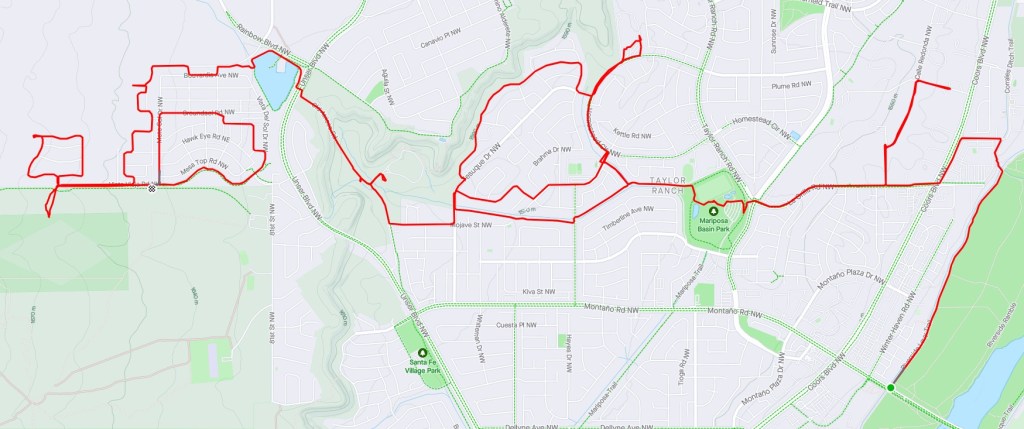 Yesterday’s ride, or at least part of it, exceeded the general scope of “slow cycling” to the point of “walking 53 lb. ebike up a couple of hundred yards of that multi-use path running from Boca Negra Visitor Center up to Unser Blvd.”