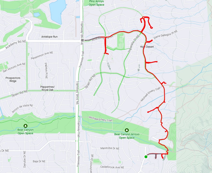 Let’s take yesterday’s ride as a Las Vegas-sized example of cheating. Riding buddy and I rode our ebikes all the way up from near UNM to the Sandia’s Embudito Trailhead, pretty much the highest point of High Desert Place, a road which winds through High Desert subdivisions east of Tramway including, but not limited to, further subdivisions “Highlands at High Desert” and “Chaco Ridge at High Desert.”