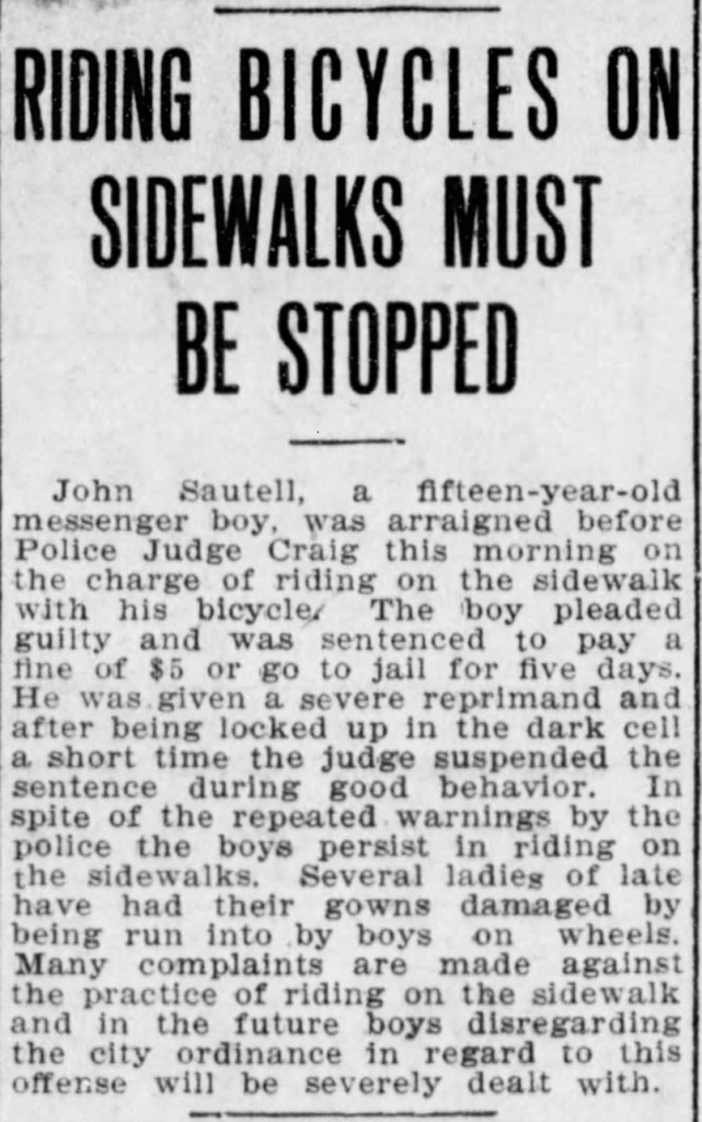 Despite Judge Craig’s sentence involving “being locked up in the dark cell for a short time,” the menace that is cyclists on the sidewalk continues to this day. Perhaps the death penalty should have been considered instead starting back in 1907. I’m just joshing, especially as a growing adopter of riding on the sidewalk myself. Why just yesterday I rode some sidewalk at Louisiana and Montgomery, and it felt great! Certainly greater than it feels riding the roadways of Louisiana at Montgomery.
