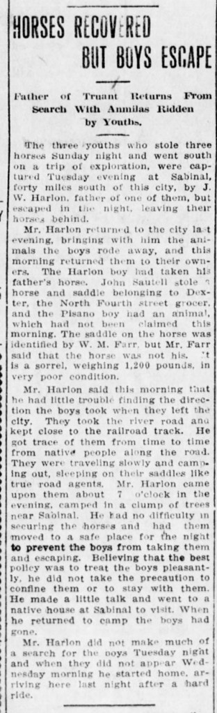 Despite what history wants to tell us about horse thieves back in the day, young Mr. Sautell and horse stealing accomplices not only did not receive the death penalty or vigilante justice, they were instead basically left to their own recognizance by someone “believing the best policy was to treat the boys pleasantly…” Maybe things weren’t quite as Billy the Kid wild back in pre-Statehood New Mexico as we have been led to believe.