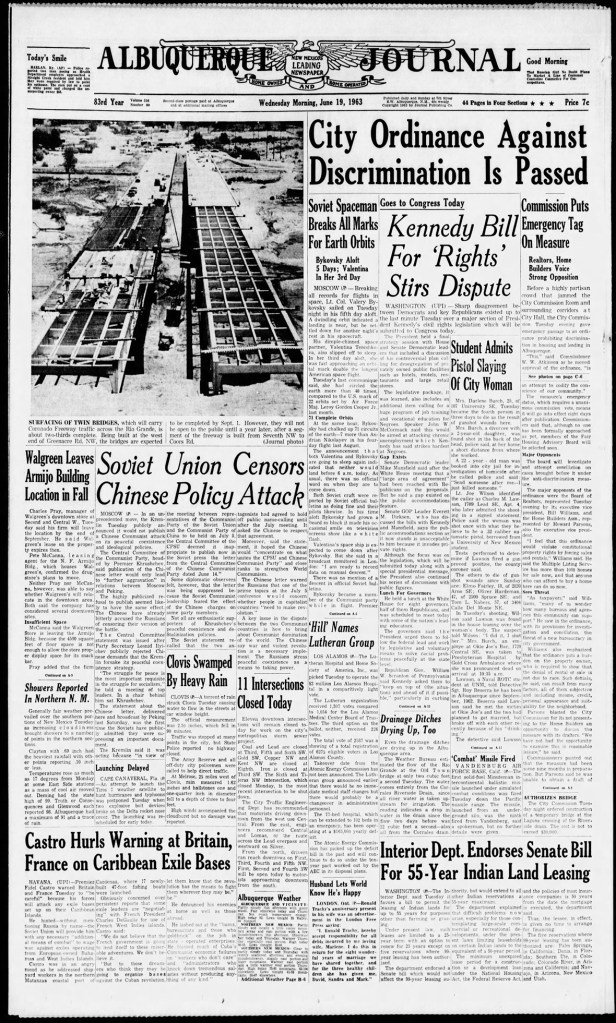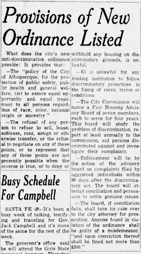 Albuquerque’s City Commission passed legislation on August 18, 1963 outlawing housing discrimination as outlined thus by the Journal the next morning: