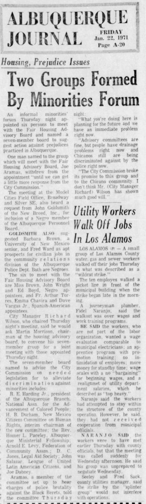 In addition to the contemporary 1971 usage of the now racist “Negro” as accepted term, we still see usage of “Spanish-American” here in supposedly triculturally tranquil Albuquerque into the 1970s. And we also see that there’s a need for “Spanish-Americans” to serve as members on a committee going to the Fair Housing Advisory Board to “suggest action against prejudices practiced in Albuquerque.”