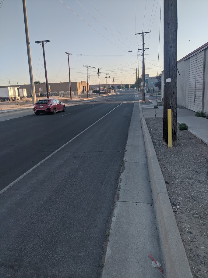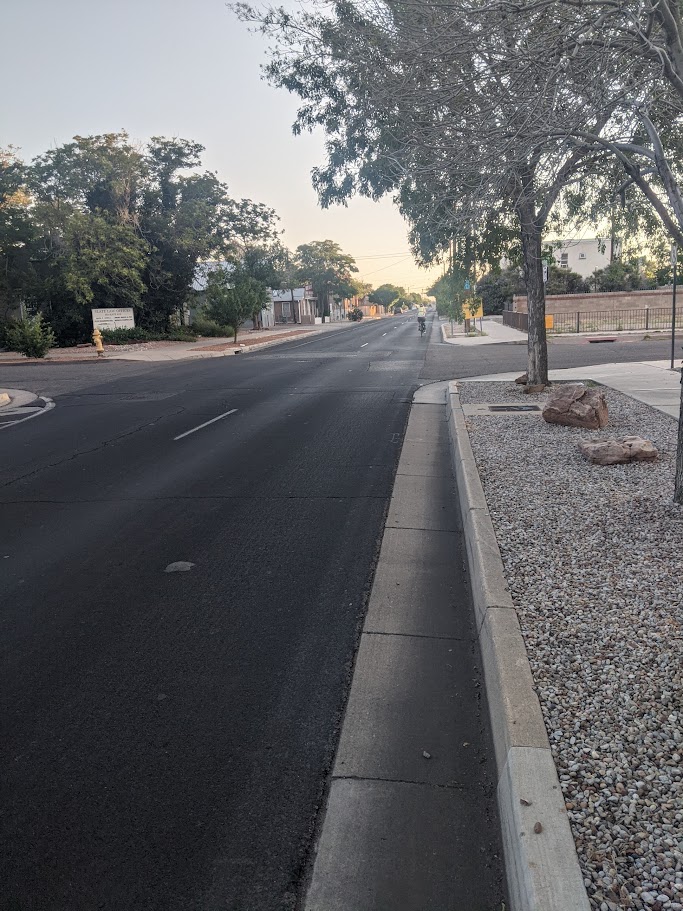 That potential goes downhill as one gets to what will eventually/maybe/probably not be the fabled Seven Cities of Gold “ABQ Rail Trail.” Despite the wider roadway and striping obstensibly for parking (note bus stop sign above; the striping is actually an attempt at “traffic calming”) there’s a very noticeable increase in driver speed here, even at 6:31 on a Sunday morning. By the time one gets to the infamous 5th/6th curve (at far, far top of photo above), Creamland milk trucks and all sorts of driver whatnot prevented taking a photo for reasons of trying to stay alive. This whole stretch is gonna take major calming, Rail Trail or no.
