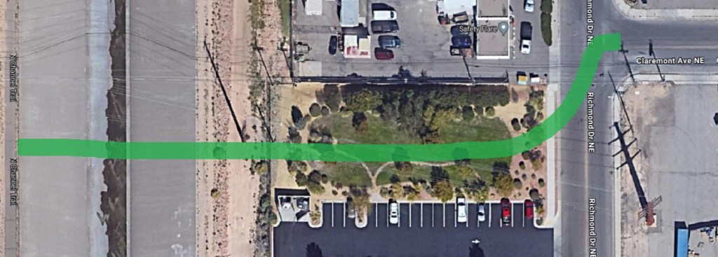 One of the many nice things about writing a blog to an audience of three readers is that I imagine each of you three has already spent countless hours staring at all of the above, has already checked the BernCo property parcel map to discover that the parklette is owned by something call Rich LLC, and has also rationalized the worthiness of such a bridge by relating it to that arroyo bridge the City built as part of its “50 Mile Activity Loop” a few years back that wasn’t really necessary because there was already a multi-use path on that side of the arroyo.