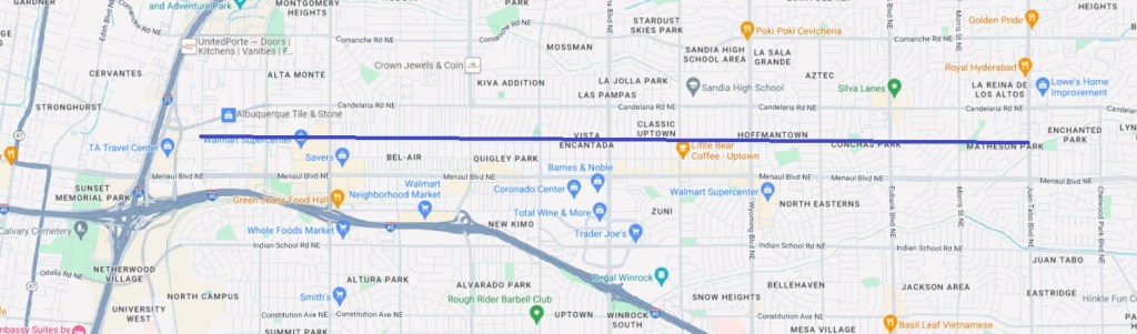 Yes, what we’re proposing here is a set of bike boulevards and multi-use paths that would get non-motorized walkers/rollers all the way from Juan Tabo and Claremont to not only the North Diversion Channel Trail, but from there to the Bosque Trail, and from there to places like Valle del Oro National Wildlife Refuge so many miles away that your humble blogger can’t count that high (or is too lazy to look at maps and count it up).