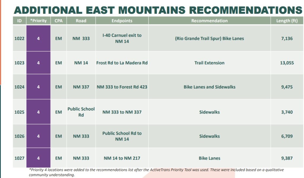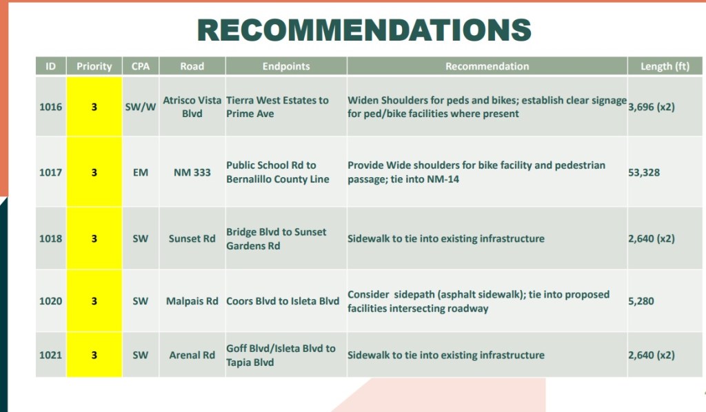 My South Valley continues to dominate Priorities 2 & 3, and there’s also recommendation for a multi-use path or sidewalk for over 13,000 feet along Central Ave. all the way from 98th St. to Atrisco Vista. That won’t be cheap. Maybe it has something to do with the ill-fated, ill-conceived City Visitor Center.