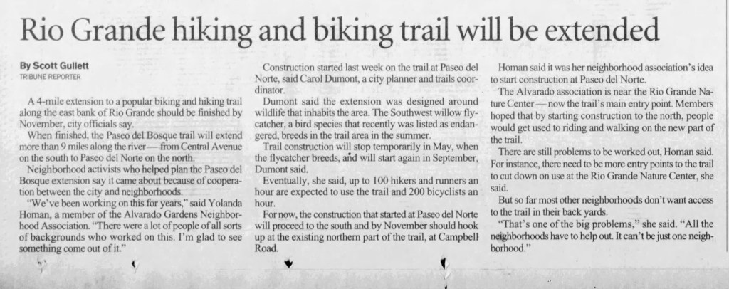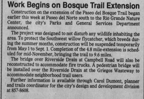 We posted the following 1977 Albuquerque Journal story and photo last week after doing a bit of research into the early days of our Paseo del Bosque Trail (i.e., the Bosque Trail; i.e., Riverside Trail):