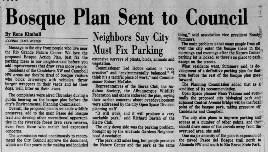 Followed only a few years later, 1993, by such growth in Trail popularity that quite a few folks living along Candelaria NE at the Nature Center are sick and damn tired of said popularity along with other public use of the Bosque outlined in a newly approved City “Bosque Action Plan”: