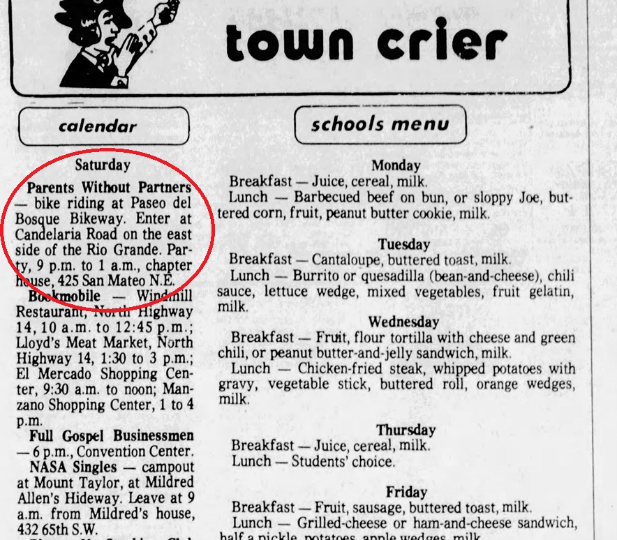 Yup, in just two years we’ve got folks in the ABQ “Parents Without Partners” chapter getting together for a ride on the Bosque “Bikeway.” Single parents leisurely chatting while fearlessly riding along our Bosque is a far cry from Hillbillies. And a further two years on in 1981, the Trail has become established and popular enough for this: