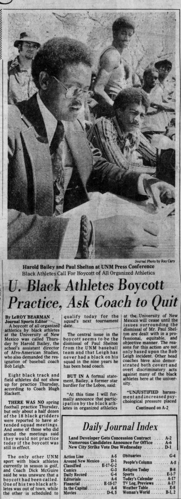 Back in 1974, Harold was UNM’s Assistant Director of Afro-American Studies while working on his Ph.D. at the school. He’d heard unsettling reports of discrimination from several UNM scholar/athletes, including recently dismissed baseball player Paul Shelton.