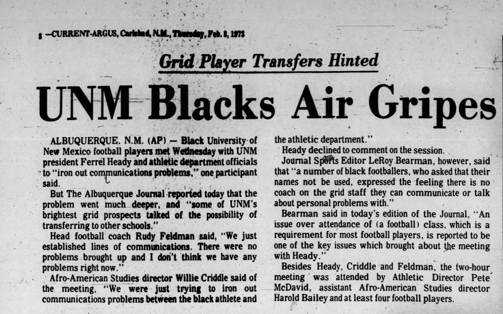 By the time of the 1974 boycott, Harold’s work in giving public voice to UNM athlete concerns had already been in place for some time. Here’s an Associated Press story printed in the Carlsbad Current Argus over a year earlier on February 8, 1973.