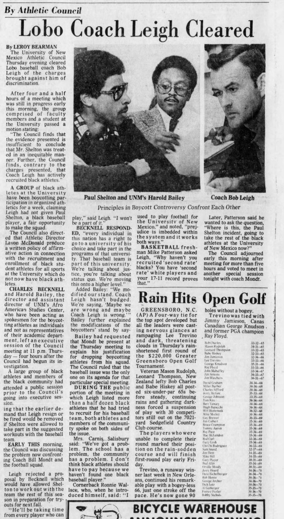 In the case of the 1974 boycott, which successfully spread to many sports, Albuquerque papers were keen to publish defenses of Coach Leigh such as this:
