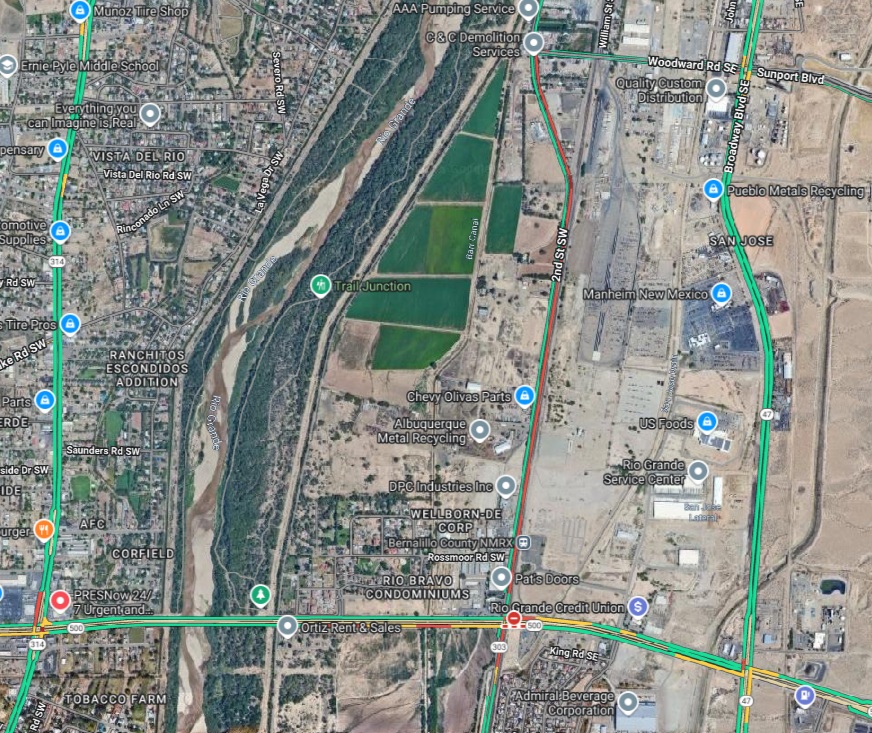 While eastbound Rio Bravo traffic was backed up all the way past the River to Isleta Blvd. (a distance of right at a mile and a quarter), things were at least moving and as of this writing at 8:30 A.M. it looks from Google Traffic that the biggest backup right now is up 2nd Street from all the drivers forced to take it up to Woodward before turning east toward I-25.