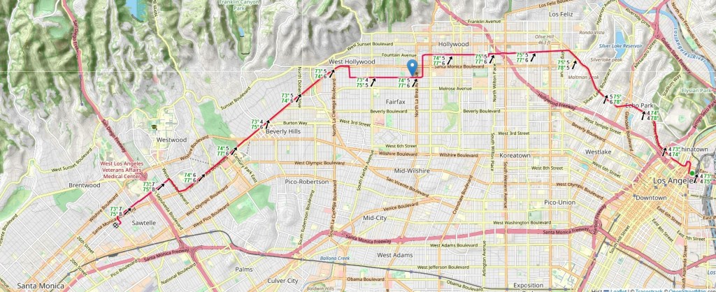 After 16 straight hours of sitting on Amtrak from ABQ to Los Angeles, I decided to eschew sanely putting the loaded bike on a Metro train out to my AirBnB in Santa Monica and, instead, rode the damn thing straight from Union Station thus: