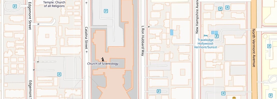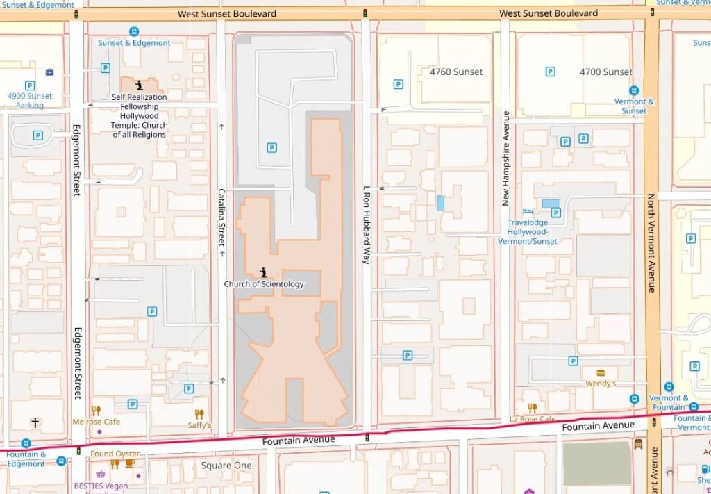 Turns out that, as I took the relative safety of Fountain Avenue off of Sunset, I went through Fountain as it intersects “L. Ron Hubbard Way” at Scientology World Headquarters, right next to the “Self-Realization Fellowship Hollywood Temple: Church of All Religions.”