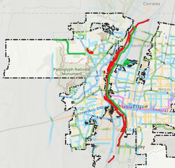 open spaces including the bosque, the Central Ave / Historic Route 66 commercial corridor, and